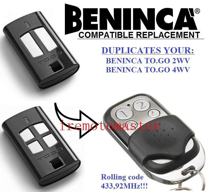 Oddaja rolling kodo in se ga programira s. Este mando de puertas automáticas BENINCA TO GO 2WV tiene frecuencia de 433. The CLchrome replaces the remotes listed. Find More Remote Controls Information about BENINCA TO. Mhz Fixed code,High Quality control assembly,China.
